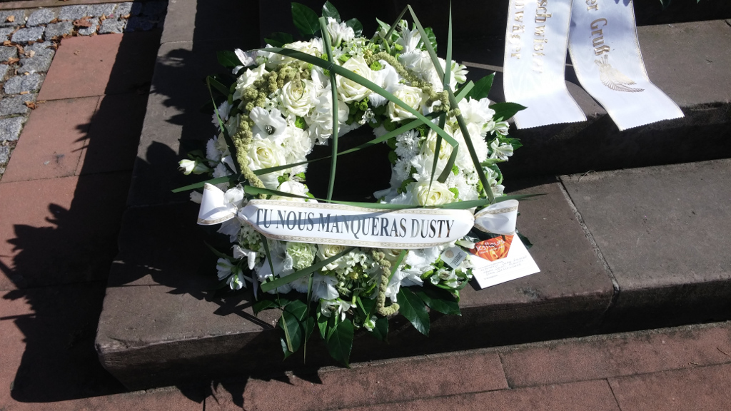 Votre couronne était exposé sur les marches de l'église. Puis je l'ai mise au cimetière où mon père reposera à partir de demain soir (mercredi 1 octobre) lors de la mise en terre de l'urne.